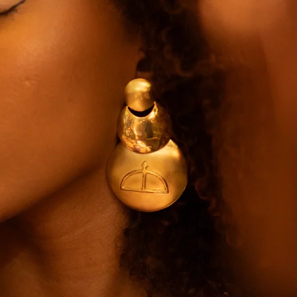 Estes elegantes brincos em ouro 18k apresentam um design inspirado no arco e flecha de Oxóssi, simbolizando a conexão da natureza com a herança cultural.