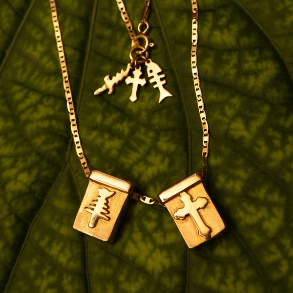 Escapulário em ouro 18k, uma homenagem ao orixá maior, o pai de todos os orixás, símbolo de equilíbrio e sabedoria, e o senhor cristo, que veio ao mundo para nossa salvação. Trazendo em seu design a conexão com o sagrado e a força espiritual que guia e protege.